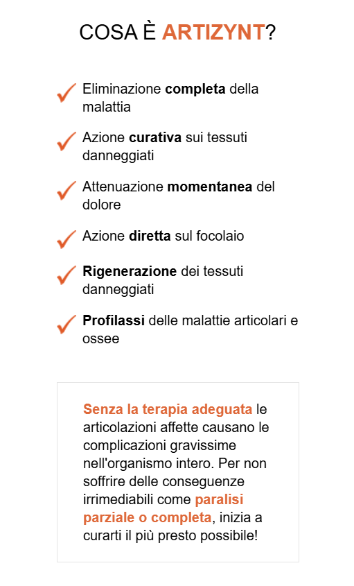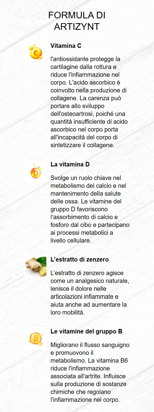Il prodotto non è un medicinale e non ha lo scopo di diagnosticare o curare patologie, ma offre un sostegno quotidiano a chi desidera migliorare il proprio comfort articolare. ARTIZYNT può essere inserito come parte di una routine di benessere, insieme a uno stile di vita equilibrato e a sane abitudini alimentari.